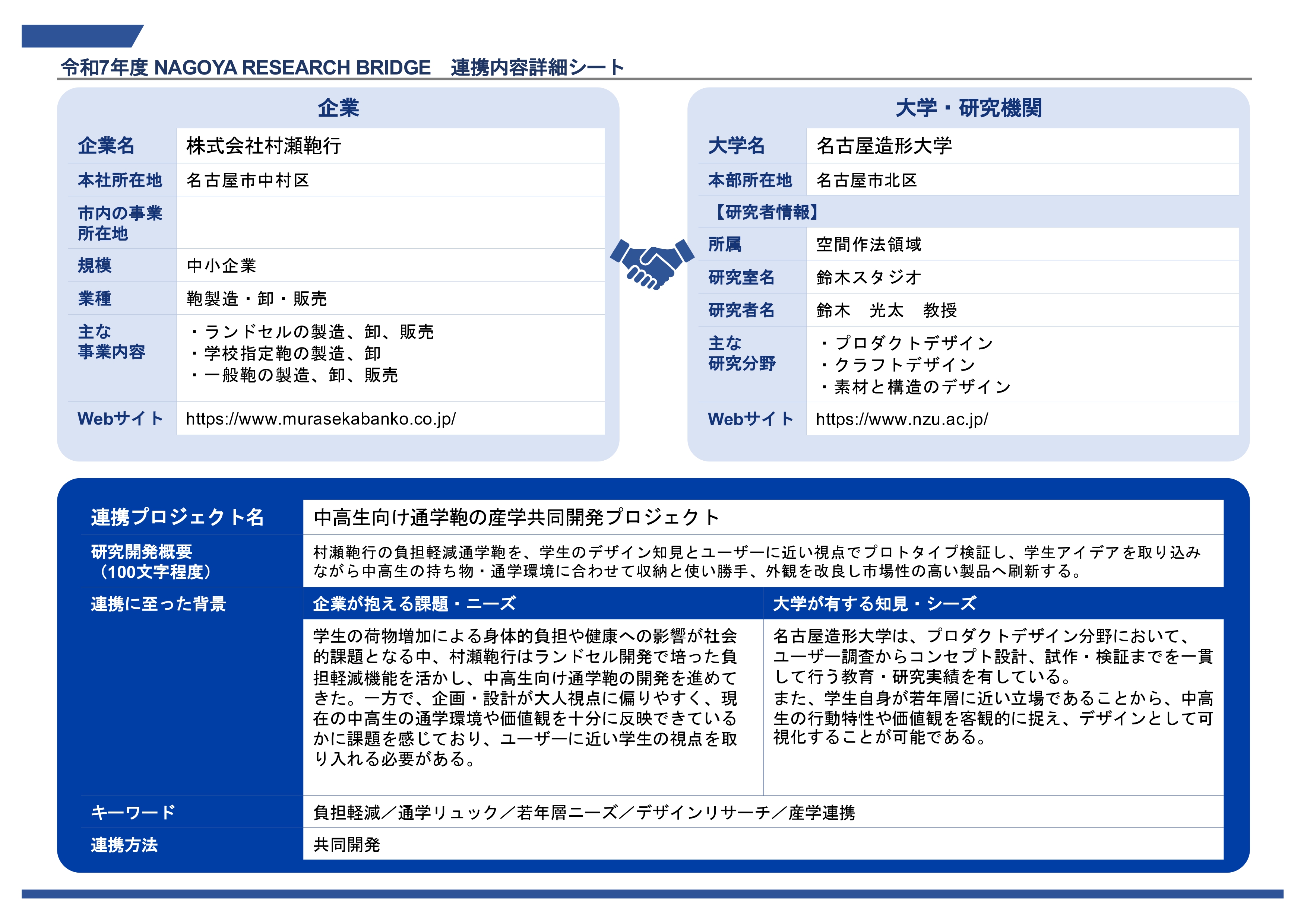 村瀬鞄行の負担軽減通学鞄を、学生のデザイン知見とユーザーに近い視点でプロトタイプ検証し、学生アイデアを取り込みながら中高生の持ち物・通学環境に合わせて収納と使い勝手、外観を改良し市場性の高い製品へ刷新する。